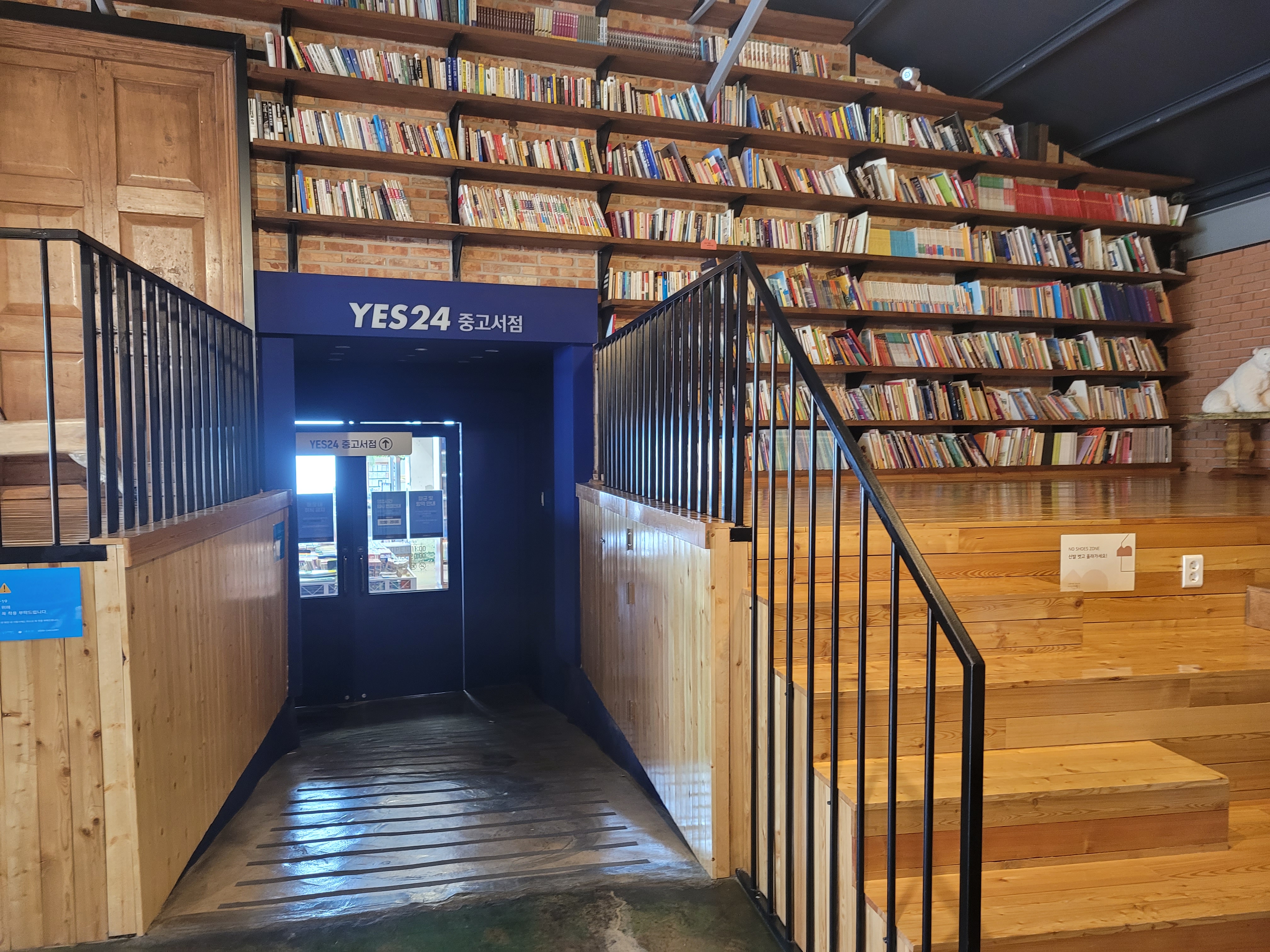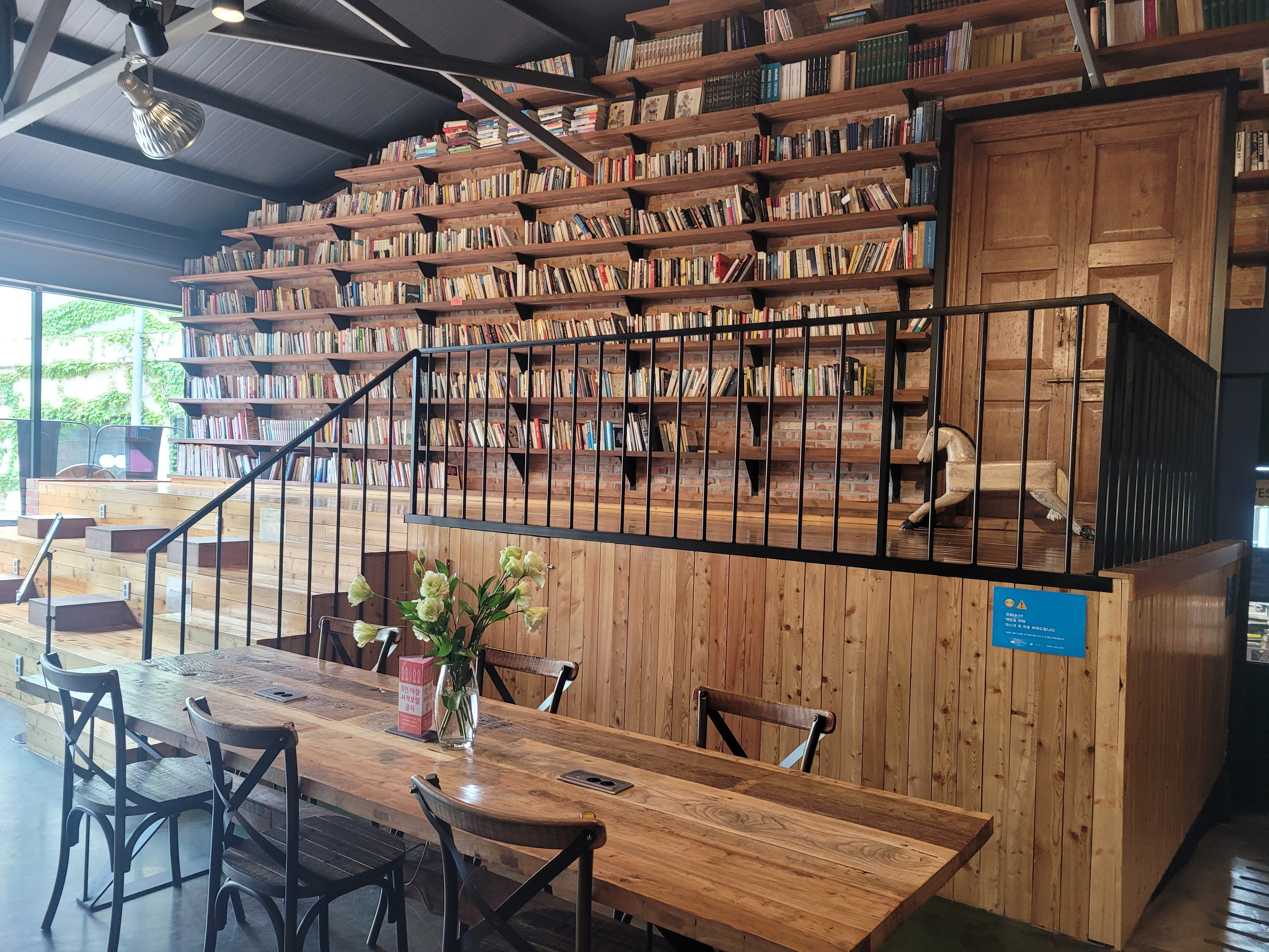 초대형 카페답게 자리도 널찍하고 한쪽은 도서관 벽면처럼 책이 진열되어있고 독서할 수 있는 공간이 있습니다.